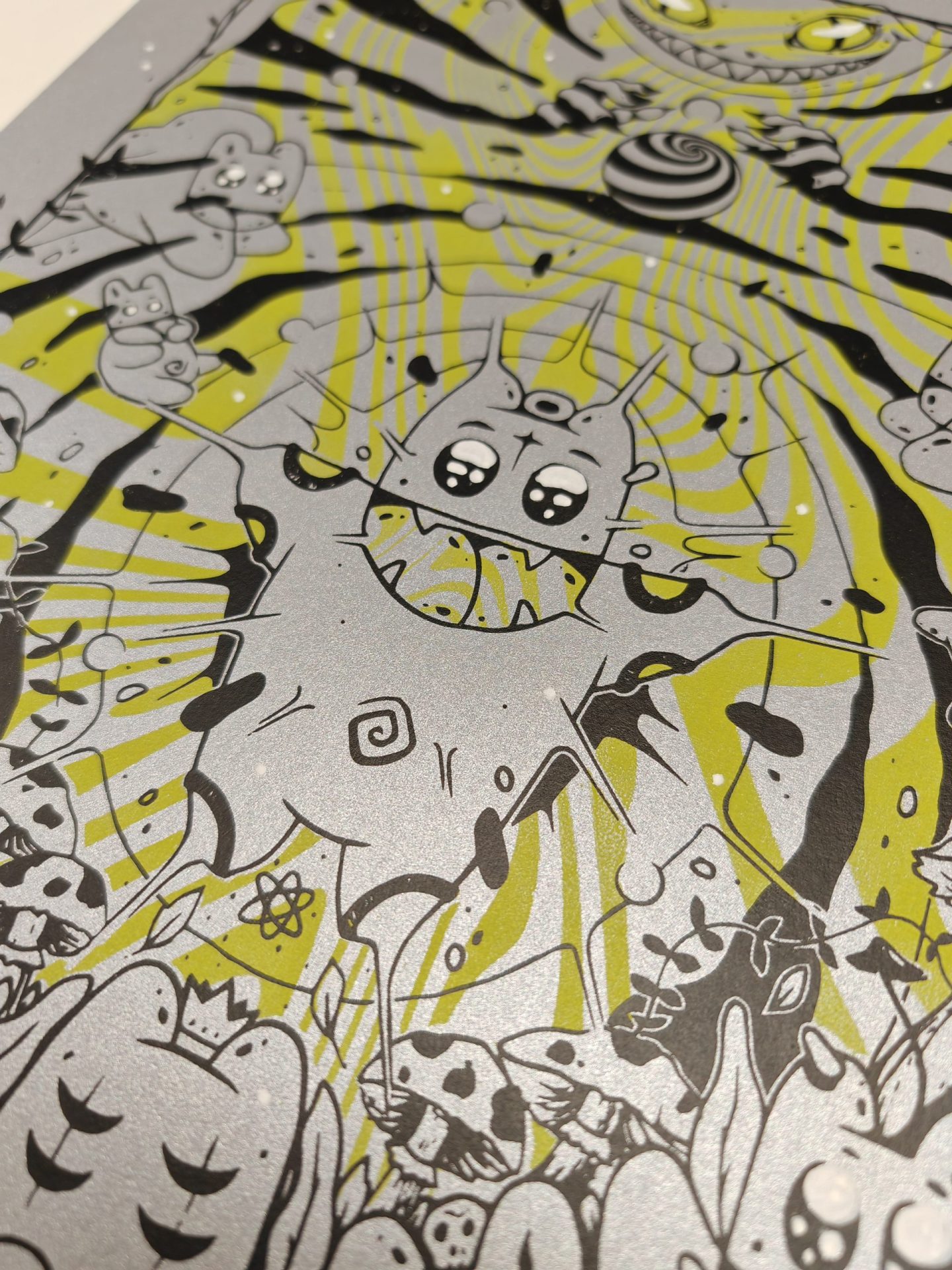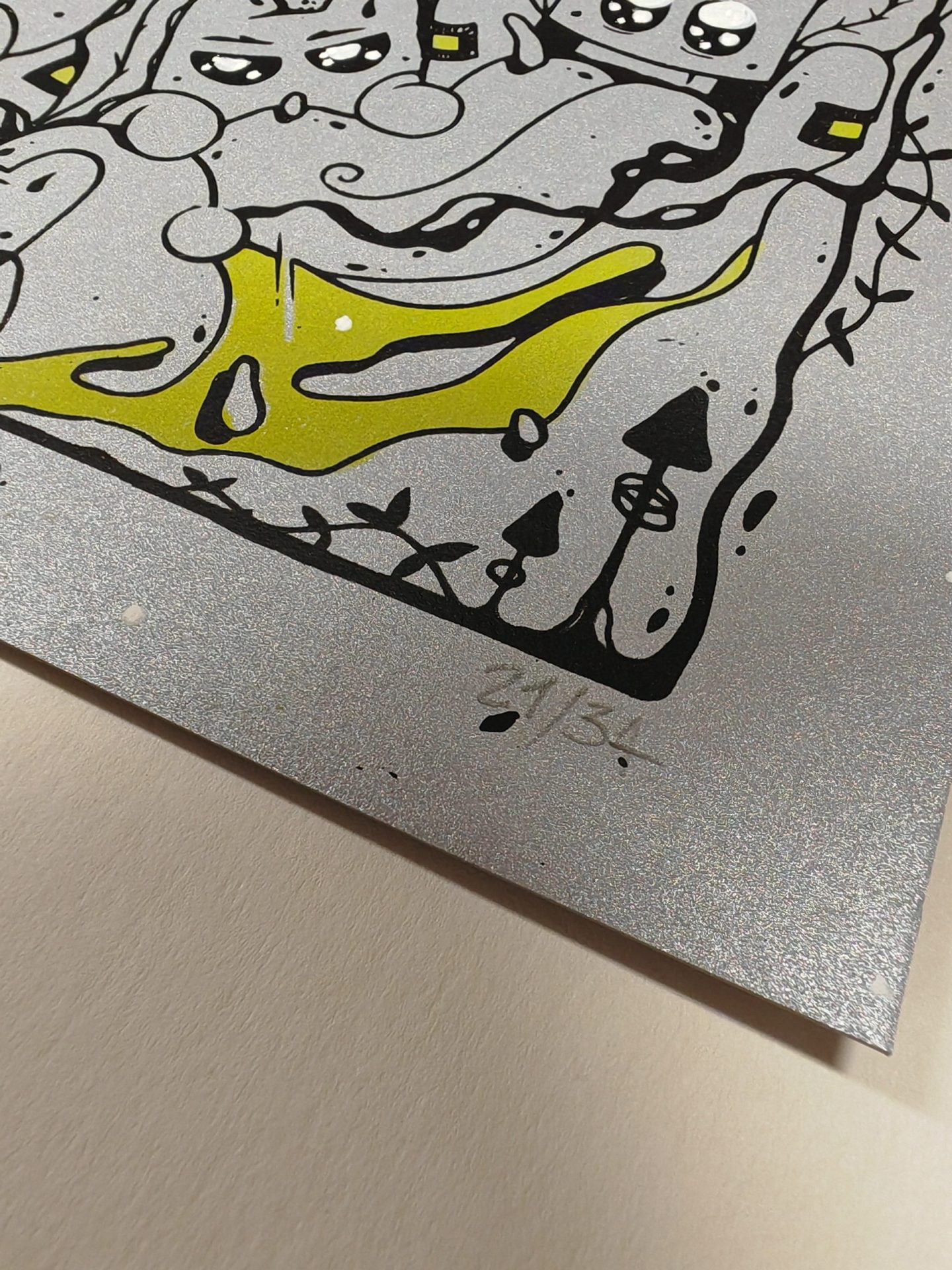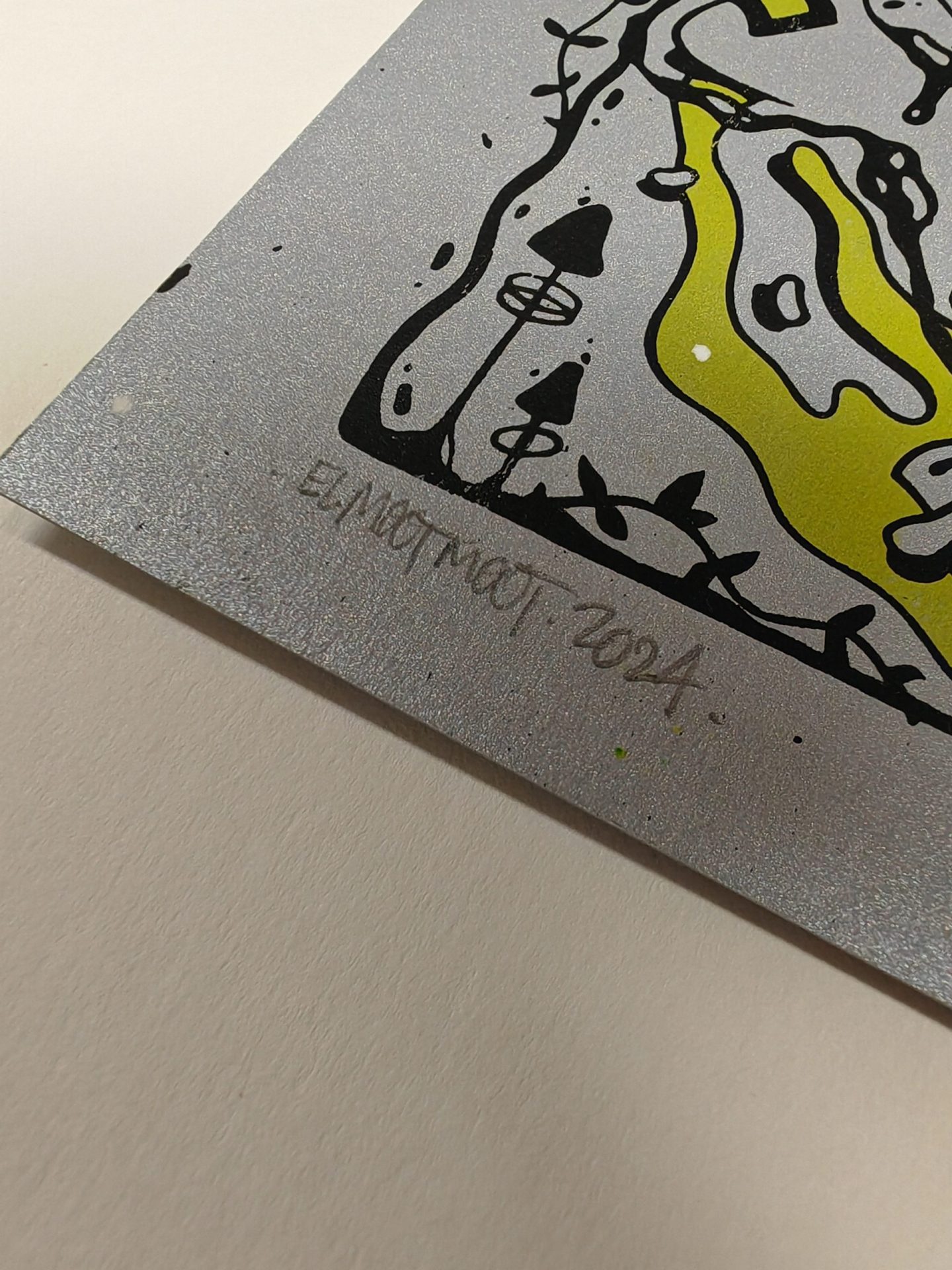Sérigraphie « Hypnose (argent & jaune) », de EL MOOT MOOT, format 29,7x42cm (A3), édition limitée.